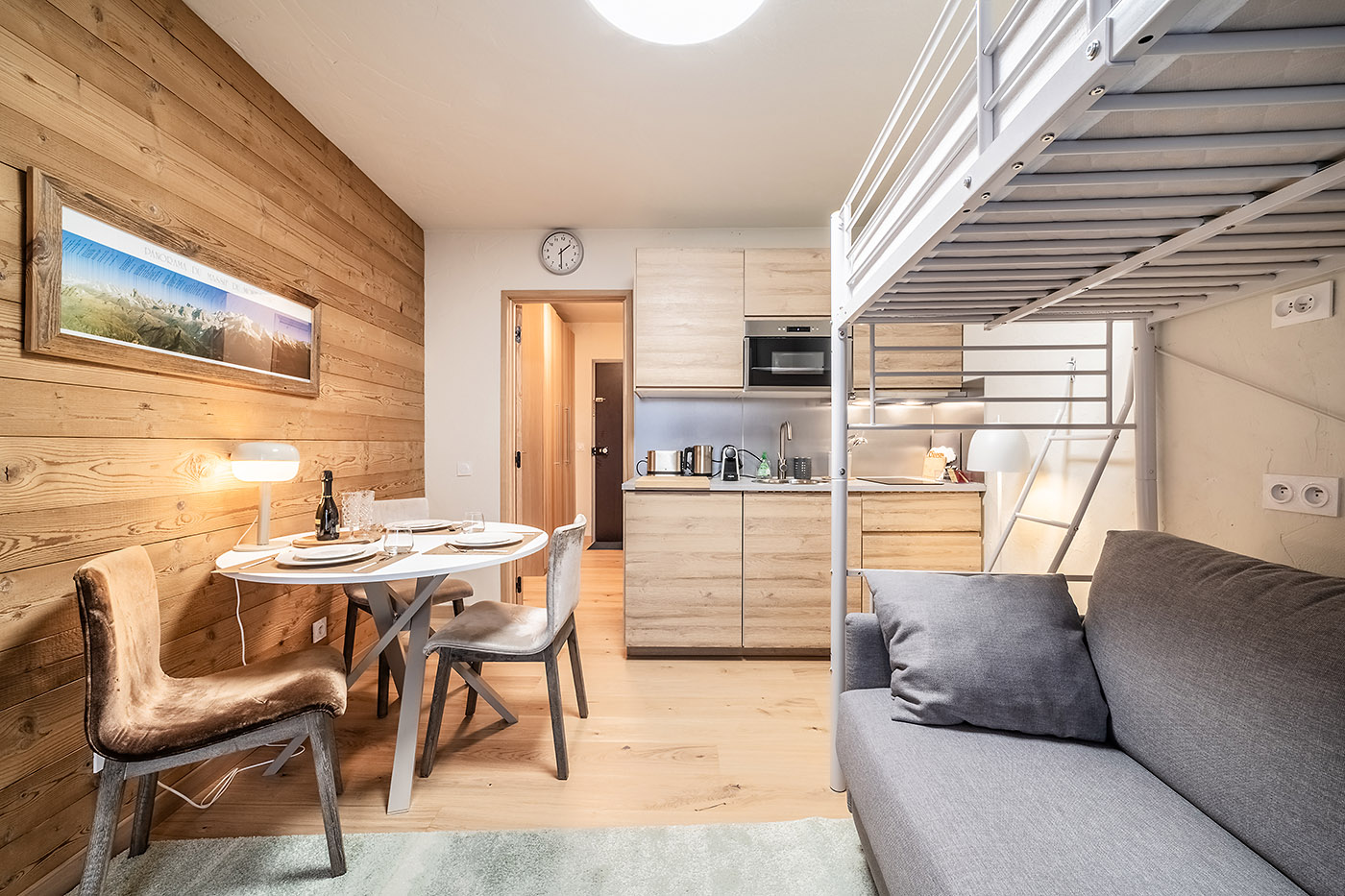 This apartment has a balcony with a view on the Aiguille du midi and the mountains. It is composed of a fully equipped kitchen, a sofa bed for 2 persons. The bathroom is equipped with a shower and a toilet. You have an access to Internet. The Residence benefits from a privileged location next to the Aiguille du Midi cable car, in the city center, close to many shops, bars and restaurants. Take advantage of this rental in the heart of the Chamonix valley, at the foot of Mont Blanc, to practice many activities and discover the mountain in a different way, in winter as in summer.